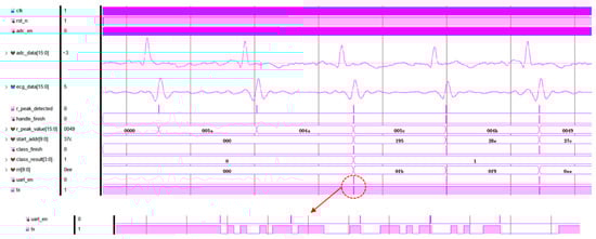 To verify the hardware functionality, a behavior-level simulation of this design is conducted using real-world human ECG signals. The ECG signal is acquired from a palm single-lead [19] and digitized by AD7606 (ADI, Norwood, MA, USA), with a signed 16-bit binary format at 360 samples per second (S/s). In the testbench, the digitized raw ECG data are input to the ASIC using the SPI protocol at the same sampling rate. The partial simulation waveform is shown in Figure 12, where adc_data and ecg_data represent the raw data and filtered data, respectively. Each R-peak is successfully detected, and after detecting three R-peaks, the RRI and classification results for each heartbeat are obtained. The RRI in the figure are 0fb, 0f9, and 0ee (hexadecimal), respectively. According to (1), the corresponding HR can be calculated as 86, 87, and 91 bpm, respectively. The ECG signal used for the test is acquired from a healthy individual, and the waveform diagram shows a classification result of 1, indicating NOR, which means the prediction performed by the ASIC is correct. After each classification, the uart_en signal generates high-level pulses that enable the UART module to transmit the data frame containing the results.