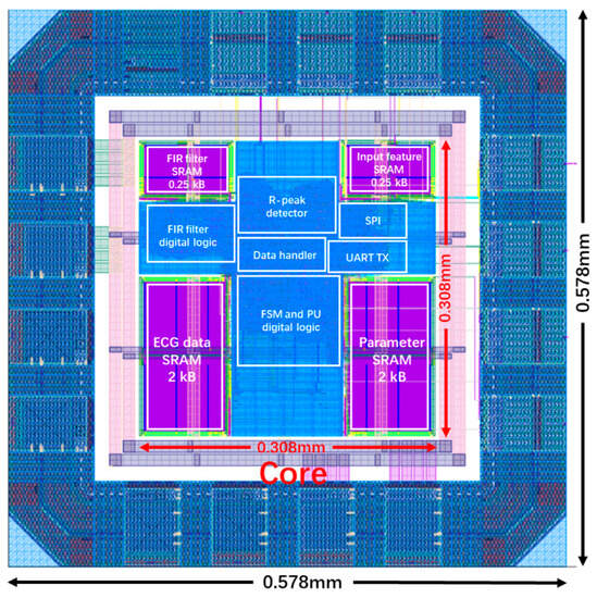 The proposed ANN-based ECG processor ASIC is implemented using 55 nm Low-K CMOS technology (UMC, Hsinchu, Taiwan, China). The post placement and routing are completed using the Innovus Implementation System (Cadence, San Jose, CA, USA); Figure 13 shows the layout photograph. The core size is 0.308 mm × 0.308 mm, and the entire chip size is 0.578 mm × 0.578 mm. The power consumption after the layout is estimated using the Power Analysis tab, and the activity file is generated by a testbench that simulates inputting ECG data to the ASIC at a 360 Hz sampling rate. This design consumes 12.88 μW at a 100 kHz clock frequency and a power supply of 1.2 V, the details of the power analysis are shown in Figure 14. The energy efficiency (Energy Eff.) can be evaluated by the energy consumption of each classification, which is calculated as follows: