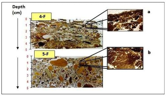 Micromorphology techniques were used for pore, aggregate and SOM distribution studies. A prism (6 cm depth × 9 cm thick × 19 cm long) was obtained from a representative surface of plots 4-F, 5-F, 8-F, and 9-F. Vertically thin sections (5 cm wide × 13 cm long × 30 µm thick) were prepared. Their description was done using an Olympus BX51 polarizing microscope (Evident, Tokyo, Japan) and according to the terminology and concepts developed by Stoops [39,40].