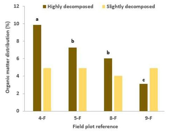 Highly decomposed organic matter predominated. Amounts were higher in the 4-F field plot than in the rest, with the 9-F plot showing the lowest value. No significant differences in slightly decomposed organic matter were found between the analyzed plots (Figure 3).