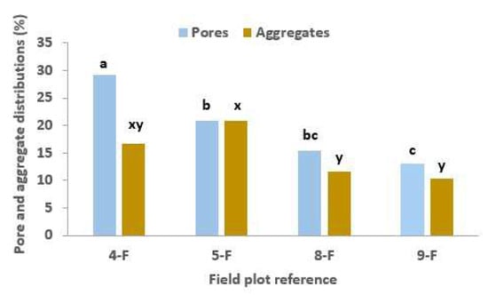 Average (n = 30) of the area occupied (as a percentage) by pores or aggregates. Columns for each studied variable, and with different letters, show significant differences in their values (p-values < 0.05) between field plots. The fullull plot description is in Table 3.