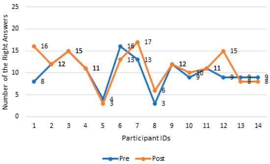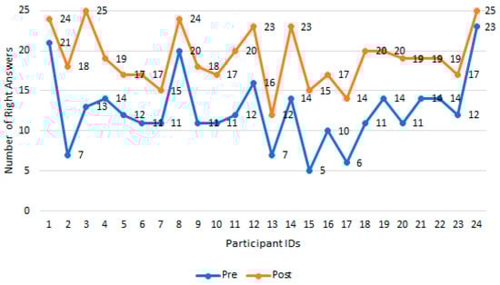 A statistical t-test [60] was performed to further compare the two groups—pre- and post-training. The confidence intervals for the two groups were set to 95% and 99%, respectively, which meant that p-values between 0.05 and 0.01, respectively, were considered statistically significant. The t-test results demonstrate that the training sessions increased the cybersecurity knowledge and skills of the participants. The mean difference between the pre- and post-training scores was 6.54. Thus, we can confirm that after the training was delivered according to the employees’ needs, preferences, and perceptions, their knowledge and skills increased. All scores are visually represented in Figure 2.