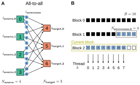 Example of connection creation using the all-to-all connection rule. (A) Each one of the four source nodes (green) is connected to all three target nodes (orange). The connections generated via this rule are identified with an index, , ranging from 0 to 11 (blue disks). (B) The connections are stored in blocks that are allocated dynamically, where, for demonstration purposes, a block size of ten connections is used. The black squares represent previous connections (established using an earlier connect call), while the twelve connections generated via the considered instance of the all-to-all rule are represented by the same blue disks labeled with as in panel A. The new connections in different blocks are generated via separate CUDA kernels. In this example, of the new connections are created in the previous block (grey frame), and the remaining ones in the current block (, yellow frame), where is computed by adding the CUDA thread index k to .