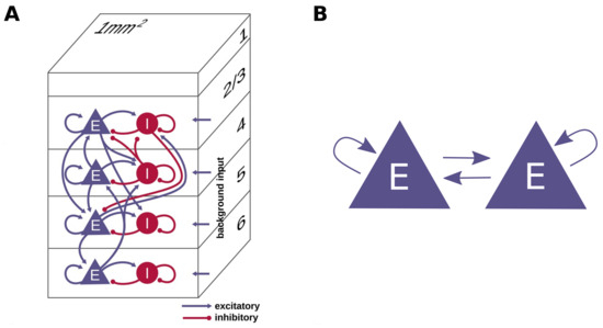 - Potjans, T.C.; Diesmann, M. The Cell-Type Specific Cortical Microcircuit: Relating Structure and Activity in a Full-Scale Spiking Network Model. Cereb. Cortex 2014, 24, 785–806. [Google Scholar] [CrossRef] [PubMed]