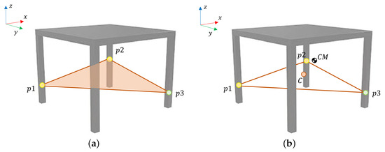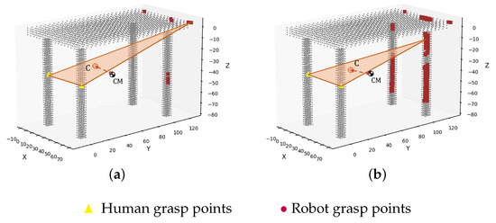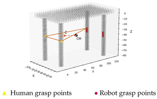 To equilibrate external loads (such as gravity) or contact points loads, the centroid of the human–robot grasp polygon should be as close as possible to the center of mass of the grasped object. For example, Figure 3b shows the centroid C of the polygon , , and the center of mass of a table, where could be or not be co-planar with grasp polygon. The goal of this metric is to minimize the distance in between and C ().
