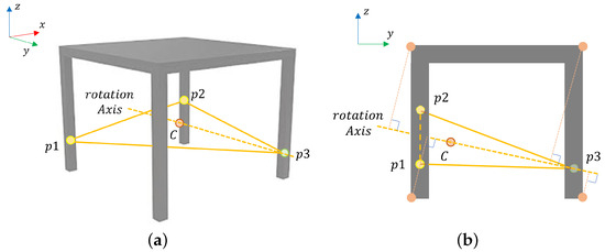 Until this point, a pair of metrics based only on steady-state geometric properties have been considered. Now, regarding the post-grasping movement of an object, it is clear that the object’s movement direction is unknown beforehand. However, the three axes (X, Y, Z) perpendicular to the main planes (, , ) in space are considered as possible motion directions that the grasped object could implement, so there are dynamic inertial forces that would affect the moving-object grasp. Figure 4a shows the main rotation axis () considered in this metric for this grasp polygon over this desk example, which is formed by the point and the centroid C of the grasp polygon. is the feasible grasp point for a robot.