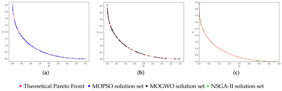 Setting parameters for MO algorithms are discussed in some researches [43,44,45,46]. The size of the population and the number of generations/iterations are set to 100 and 20 runs for all the test functions. In the NSGA-II algorithm, the selection percentage is set to 50% and the mutation percentage is set to 1%. For the MOPSO algorithm, = = 2 and the inertia weight w decreases from = 0.9 to = 0.4. Lastly, for both MOPSO and MOGWO algorithms, and are random values between 0 and 1.