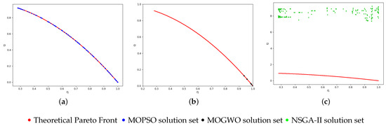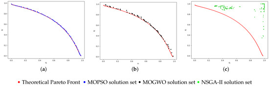 Pareto Front for FON Function. (a) MOPSO; (b) MOGWO; (c) NSGA-II.
