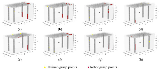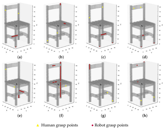 Figure 11 shows a chair simulated by a cloud of points with different possibilities of human grasp points (yellow triangles) and diverse zones of grasp points that the robot could make use of to perform the task (red circles). For instance, concerning grasping in Figure 11f, we can see a possible human grasp positioned on the front of the chair and a large area of points where the robot could grasp on the back of the chair. None of these blue dots is better or worse than the others; they are simply the best that accomplish the three grasp-planner metrics. Any of these could be taken as a grasping point for the robot.