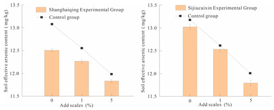 The variation in effective arsenic content in soil is related to many factors, and it is necessary to control not only the proportion of passivating agent added during the experiment, but also the effects of soil pH, dissolved organic matter (DOM) content and crop root exudates [29]. Studies have shown that the mobility and solubility of As in soil are closely related to pH value. When the soil pH value increases, it is more conducive to the release of As, which in turn increases the content of effective As in the system, which negatively affects the growth and development of crops [30]. Compared to the acidic soils of southern China, most farmland in northern China is alkaline. Therefore, it is recommended to use a pH-neutral passivator when improving the soil of alkaline farmland [7,8].