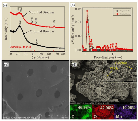 XRD characteristic map images (a), particle size distribution images (b) and scanning-electron microscopy images (c,d) of biochar and MnO2 modified biochar.