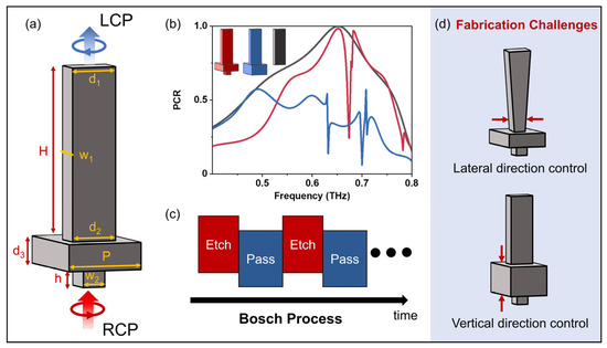 Here, we develop a fabrication technology to realize high-performance silicon meta-devices for controlling THz waves with diversified functionalities. We first design a silicon meta-atom consisting of a high-AR micro-pillar (see Figure 1a), and then systematically study how the fabrication quality can affect the final performance of a meta-device constructed from such meta-atoms. We next examine how two crucial steps in deep-reactive-ion-etch (DRIE) technology [40,41,42] (i.e., the etch phase and the passivation phase) influence the quality of the fabricated structure, based on which we develop an optimized Bosch process to fabricate silicon meta-devices with the best qualities by balancing the two working phases. Finally, we employ the developed Bosch process to fabricate a silicon THz meta-device with an AR of 12:1, and experimentally characterize its polarization-control performance.