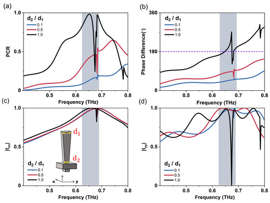 Simulated spectra of the polarization conversion ratio (a) and phase difference (b) between the x- and y-polarized transmissive THz wave, and the transmission amplitudes for the x-polarized (c) and y-polarized (d) transmissive THz light for the meta-atom with different sidewall slopes characterized by d1 and d2, the gray area in the figure covers the meta device working frequency.