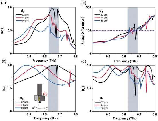 Simulated spectra of the polarization conversion ratio (a) and phase difference (b) between x- and y-polarized transmissive THz wave, and the transmission amplitudes for the x-polarized (c) and y-polarized (d) THz wave of the meta-atom with different thickness of the connecting layer characterized by d3, the gray area in the figure covers the meta device working frequency.