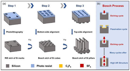 As shown in Figure 4b, the Bosch process is a time-multiplexed silicon etching procedure consisting of multiple switches between the etching cycle and the passivation cycle [40,41,42] to guarantee a highly directional etch. In the passivation active cycle, a thin film of fluorocarbon, also called the inhibitor, is deposited all over the structures. In the following etch-active cycle, the reactant will first remove the inhibitor, then etch the silicon in depth. In return, the etch rate in the horizontal direction is dramatically different from the vertical direction, since the sidewall of the silicon has been well protected by the inhibitor. Therefore, the anisotropic etch in the vertical and lateral directions in the silicon substrate can be realized by switching these two cycles in time.