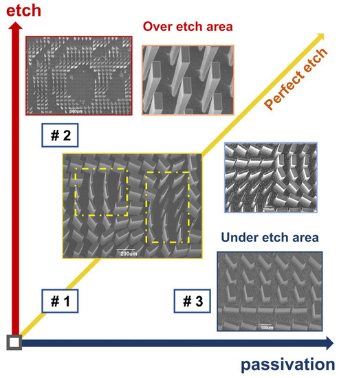 On the other hand, when the etch step suppresses the passivation step, the reactant will exhaust the inhibitor on the surface of the etched structures, and eventually lead to an isotropic etch in the vertical and lateral directions. In this case, the inhibitor on the sidewall will first be removed, and the sidewall of the structure will be etched, resulting in lateral etching. As the time-multiplexed process proceeds, the undercut of the bottom region of the structure will move further in the lateral direction of the pillar, and finally lead to the sidewall slope, even collapsing the micro-pillars, as shown with case #2 in Figure 5.