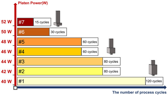 Schematics of the multi-stepped etching process with a gradual decrease in cycle number and a gradual increase in platen power for the fabrication of tri-layered metasurfaces.