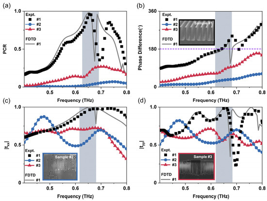 In contrast, sample #3 without precise quality control on the VTD exhibits very poor polarization conversion capabilities with a PCR of ~25%, as shown by the red tri-angles in Figure 7a. From the measured spectra shown in Figure 7b–d, one can notice the phase difference between the x- and y-polarized transmitted THz waves decrease to 90°, and the transmission amplitude for both polarizations also drops significantly at the designed working frequency. The main reason might be related to the distorted anisotropy properties of meta-atoms, due to the presence the micro-grass effect, as illustrate by the inset in Figure 7d.