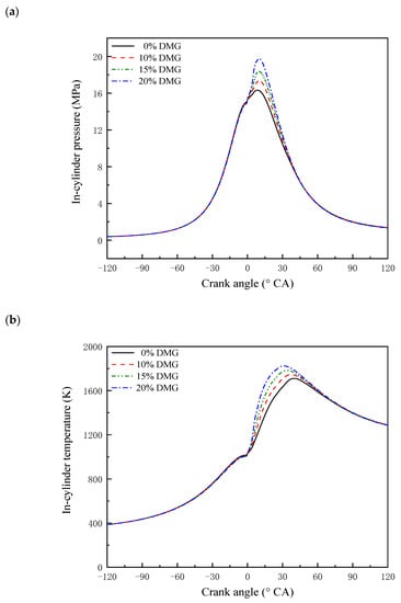 Effects of different DMG substitution ratios on in-cylinder combustion: (a) Pressure; (b) temperature.