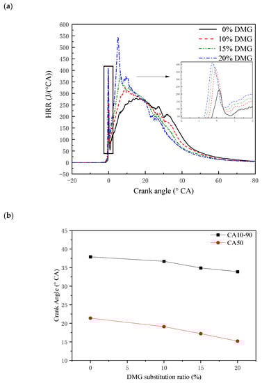Effects of different DMG substitution ratios on HRR: (a) Profiles of HRR against crank angle; (b) CA10-90 and CA50.