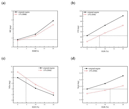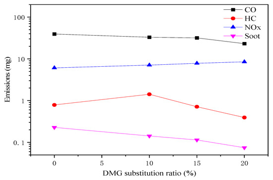 HC, CO, NOx, and soot are regulated emissions of a diesel engine. This section focuses on analyzing the effect of DMG addition on these emissions. Figure 6 illustrates the variations in emissions with different DMG substitution ratios.