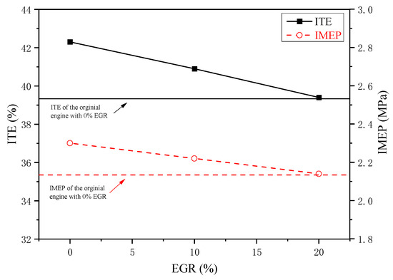 Figure 7 shows the effects of EGR on the ITE and IMEP of the dual-fuel engine. It is evident that as the EGR rate increases from 0% to 20%, the ITE decreases from 42.3% to 39.4%, and the IMEP decreases from 2.33 MPa to 2.14 MPa. The results further reveal that, although EGR exhibits an adverse influence on both ITE and IMEP, the power output and fuel economy of the dual-fuel engine remain superior to those of the original engine as long as the EGR rate is below 20%.