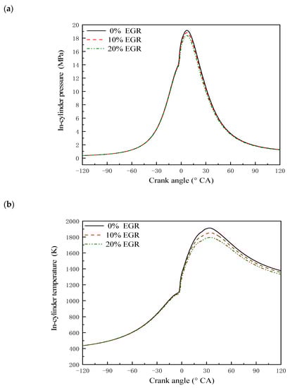 Effects of different EGR rates on in-cylinder combustion: (a) Pressure; (b) temperature.