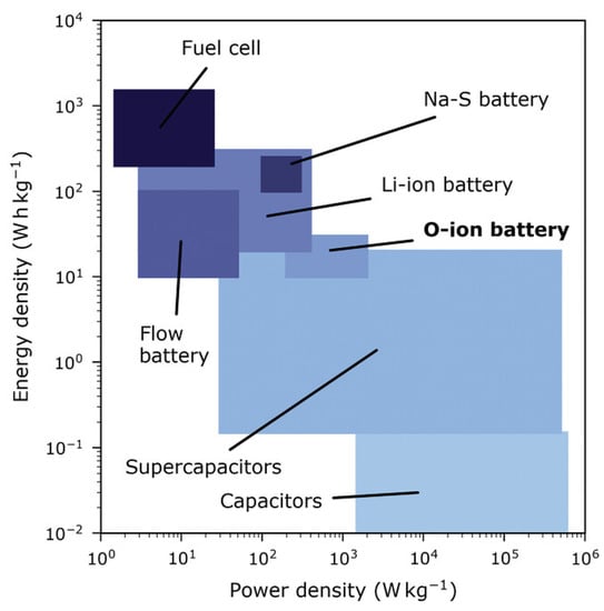 A schematic comparison of the potential power and energy density of oxygen ion batteries with related electrochemical technologies [].