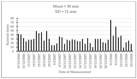 When rainfall and runoff data are available, the runoff potential of RWH techniques can be assessed using the CN approach []. The CN method is a procedure used to determine the potential runoff from a rainfall event in a given land area []. A CN can be defined as the proportion of rainfall that gets converted into runoff in a given surface area, and its value ranges from 0 to 100 [,]. The soil’s hydrological conditions, soil type, antecedent soil moisture content, land use, and the treatment applied (e.g., tillage or mulching) to a given area of interest, influence the CN [,]. The importance of CNs in agricultural research includes the fact that CNs are an important input parameter for crop models and can be used for water-logging forecasting in cropping systems, the modification of soil water conservation techniques for increased infiltration, and a better understanding of water balance at plot or field level [,,,].