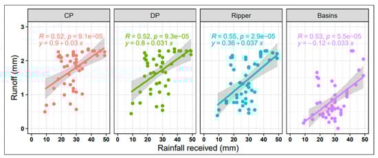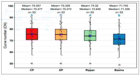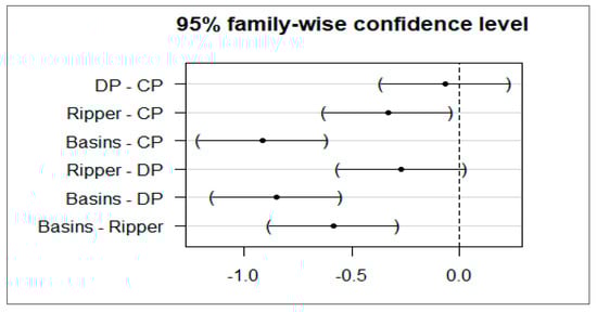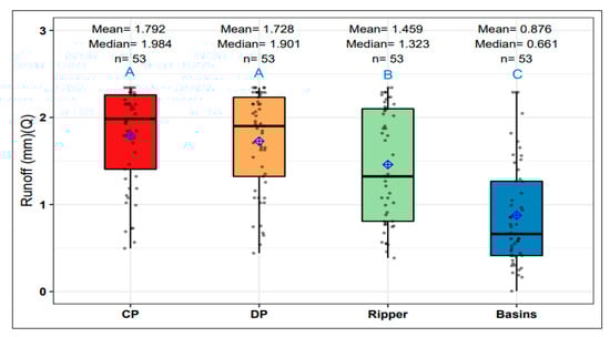 Tillage effects on runoff generation were significant (p < 0.001), and the planting basin treatment had the lowest runoff amount recorded (Figure 3). The grid of 0.9 m × 0.6 m spaced planting basins created a higher surface roughness than the other tillage treatments, and this facilitated more rainwater harvesting and infiltration, hence the reduced runoff generation recorded. The surface roughness created by the basin grid increased surface water storage potential, a result consistent with rainfall simulation experiments by []. Using the Tukey test to unravel the tillage effects on runoff amount generated, results showed that runoff amounts in CP and DP, and DP and ripper treatments were similar (Table 2, Figure 3 and Figure 4). Runoff from CP was significantly (p < 0.05) higher than that from the ripper treatment (Figure 3; Table 2). The confidence intervals for DP-CP and Ripper-DP cross the zero line, and this indicates that the runoff amounts from these two tillage treatments are not significantly different (Figure 4).