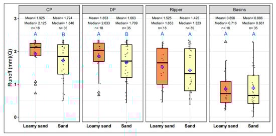 Runoff amounts generated in different tillage treatments under sandy and loamy sand soils across sites and seasons in Gwanda and Insiza districts, Zimbabwe. Means with the same letter are not significantly different (5%). The crossed blue square in each box plot represents the treatment mean.