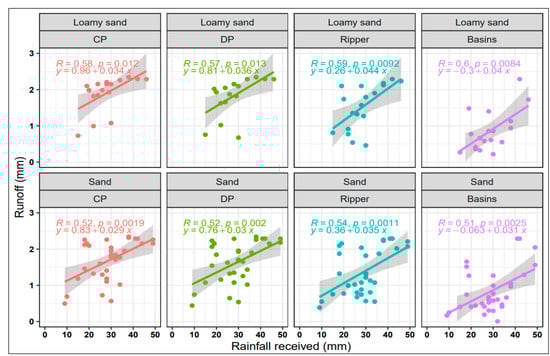 Runoff generation was higher in loamy sand than in sandy soil in the CP and DP tillage treatments (Figure 6). The heavy rainfall events recorded at experimental sites could have promoted more surface sealing of the soil in loamy sand, which has more silt content. The sealing of soil pores in the surface layer slows the infiltration of rainwater, and this in turn promotes the generation of more overland flow in loamy sand than sandy soil. On the contrary, runoff was higher in sandy soil than in loamy sand in the planting basin treatment. Loamy sand had 12%, 11%, and 7% more runoff than the sandy soil under CP, DP, and Ripper, across sites, respectively. In the planting basin treatment, sandy soil had 3.4% more runoff than loamy sand across sites. Runoff generation at any given slope of land varies with soil texture []. Jourgholami and Labelle’s [] study showed that clayey soil generated more runoff (1.49 mm) than loam soil (1.03 mm) at the same slope and plot size. The runoff amount increased with an increase in rainfall amount regardless of the soil texture (Figure 7). The results in Figure 6 are consistent with the findings of [], where more surface runoff was generated in clayey than light-textured soil in the conventionally ploughed treatments. However, the runoff was similar in loamy sand and sandy soils in the minimum tillage treatments. This can be attributed to better infiltration in minimum-tillage systems arising from improved soil structure, which occurs through increased porosity and reduced bulk density [,].