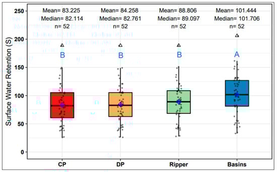 Surface water retained in different tillage treatments across sites and seasons in Gwanda and Insiza districts, Zimbabwe. Means with the same letter are not significantly different (5%). The crossed blue square in each box plot represents the treatment mean.