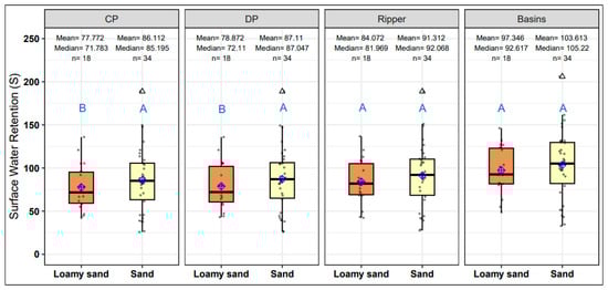 Surface water retained in different tillage treatments under sandy and loamy sand soils across sites and seasons in Gwanda and Insiza districts, Zimbabwe. Means with the same letter are not significantly different (5%). The crossed blue square in each box plot represents the treatment mean.