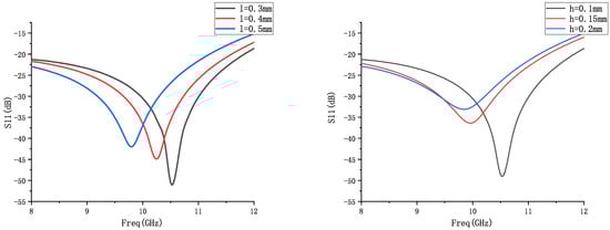 The return loss is the ratio between the energy lost due to the reflection of the signal in the transmission process and the energy of the input signal [25]. A comparison of the return loss simulation results is shown in Figure 3 below. This conclusion can be obtained from the comparison result graph: as the arch height and span increase, the resonance point is shifted to the lower frequency, and the return loss is below −15 dB in the X-band (8–12 GHz), and at the resonance point near the center frequency of 10 GHz, it reaches −52 dB, which indicates a good matching performance.