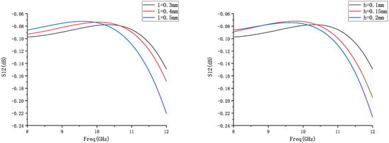 Insertion loss is the ratio of the output signal to the input signal, the larger the value, the smaller the transmission loss of the signal and the better the electromagnetic shielding effect [26]. A comparison of the insertion loss simulation results is shown in Figure 4 below. The conclusion can be obtained from the comparison result graph: with the increase in arch height and span, the loss increases gradually, especially in 10–12 GHz is more obvious, but its microwave transmission characteristics still meet the design requirements, and at the resonance point near the center frequency of 10 GHz, it reaches −0.07 dB.