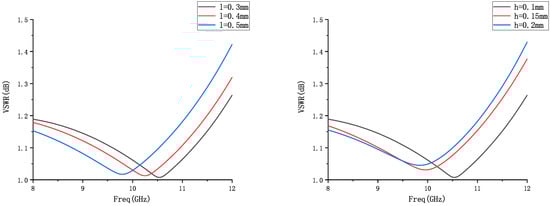 The closer the VSWR is to 1 indicates that most of the energy is transmitted to the T-match network through our designed gold filament, and only a small portion of the energy stays in the chip in the form of standing waves [27]. The VSWR comparison results are schematically shown in Figure 5 below: with the increase in arch height and span, the VSWR is better than 1.45 dB throughout the X-band (8–12 GHz), in the close to the center frequency of 10 GHz At the resonance point near the center frequency of 10 GHz, it is even closer to 1.05 dB, which is an excellent performance.