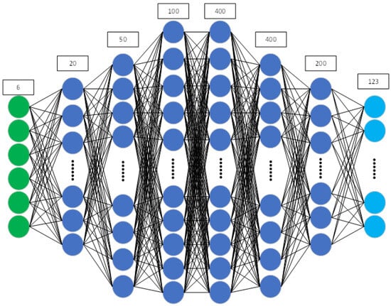 The number of neurons in the input layer is 6, and the number of neurons in the output layer is 123, including 6 hidden layers. The number of neurons and activation function of each layer are shown in Table 2: Among them, the neurons are numbered h1–h6 from left to right, BN is Batch Normalization, which normalizes the value of the input activation function in the hidden layer and enables the data to be mapped to a reasonable interval without changing the data distribution characteristics. This makes the gradient training of hidden layer energy more stable during backpropagation and helps prevent overfitting of the neural network. Another way to prevent the neural network from overfitting is to introduce the Dropout mechanism. That is, for the hidden layer training, the internal neurons do not adopt the form of full connection with the next layer, but will randomly drop some of them, thus enhancing the generalization of the neural network and preventing overfitting.