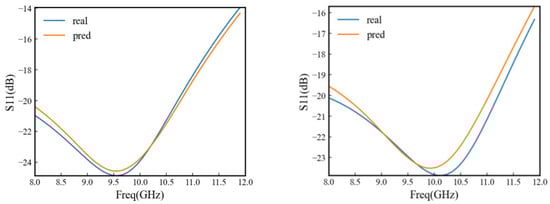 The experiments show that in the X-band, at the resonance point near the center frequency of 10 GHz, inputting the value 52 into the neural network model, the simulation and prediction results of return loss in figure (left) are both close to −25 dB, and the average error between them is within 0.2 dB, inputting the value 674 into the neural network model, the simulation and prediction results of return loss in figure (right) are both close to −24 dB, and the average error between them is within 0.3 dB. The prediction results of the return loss neural network are shown in Figure 9.
