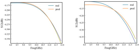 Experiments show that in the X-band, at the resonance point near the center frequency of 10 GHz inputting the value 193 into the neural network model, the simulation and prediction results of insertion loss in figure (left) are both close to −0.2 dB, and the average error between them is within 0.05 dB, inputting the value 682 into the neural network model, the simulation and prediction results of insertion loss in figure (right) are both close to −0.16 dB, and the average error between them is within 0.1 dB and the insertion loss neural network prediction. The results are shown in Figure 10 below.