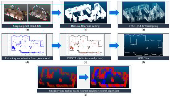 Next, the extracted x- and y-coordinates of the structural element candidates are clustered through DBSCAN, as shown in Figure 1e. DBSCAN is used to group the points with similar spatial coordinates into clusters, which helps identify the structural elements. The SOR filter is then applied to obtain more accurate structural element candidates, and the indoor clutter objects are removed, as shown in Figure 1f. The SOR filter is used to smooth the surface of the structural element candidates and remove the remaining noise data. Finally, the obtained structural element candidates are used to search the structural elements in the point cloud using an unsupervised radius-based nearest neighbor search algorithm, as shown in Figure 1g. Once the voxel size is determined, the proposed method operates automatically, except for the SOR filtering step. The parameters required for each step are automatically determined based on the voxel size. The details of these steps are explained in Section 3.2.
