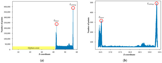 The proposed method was developed based on the Manhattan World assumption. According to the abovementioned assumptions, the histogram of the number of points according to the z-coordinate of the point cloud shows a sharp rise near the floor and ceiling, as seen in Figure 2a. However, there may be outdoor outliers of the target object based on the z-axis. To consider these outliers, the proposed method uses the average of the number of points based on the z-axis. This method automatically obtains the z-coordinates of the floor and ceiling by following these steps: (1) determining the average value of the number of points according to the z-coordinate; (2) preserving only the z-coordinate that has a greater number of points than the average number of points, as shown in Figure 2b; (3) distinguishing the low-ranking 30% and high-ranking 30% data based on the z-coordinate from the preserved z-coordinate and number of points data; and (4) determining the z-coordinates at which the number of points is maximized from the low- and high-ranking 30% data as the floor and ceiling z-coordinates, respectively.