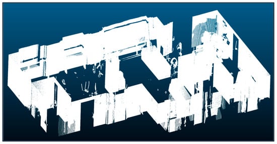 The obtained floor and ceiling z-coordinates were used to remove the floor and ceiling. For this purpose, the value that added 0.2 m to the floor’s z-coordinate () was defined as (for the data intended to be preserved), as shown in Equation (1). In addition, the value that subtracted 0.2 m from the ceiling’s z-coordinate () was defined as (for the data intended to be preserved), as shown in Equation (2). was determined using Equation (3), according to the determined and . The determined , , and were used to determine the parameters of the DBSCAN, SOR filter, and unsupervised radius-based nearest neighbor search algorithm in conjunction with the voxel size (used in the voxel-grid downsampling that will be performed subsequently). Figure 3 shows the data from which the floor and the ceiling were removed based on the z-coordinate of the determined and .