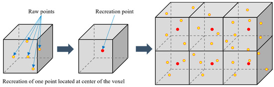 The point density of a point cloud obtained by a three-dimensional (3D) scanner varies depending on the distance between the scanner and the target of scanning. Objects that are far from the 3D scanner have a lower point density, whereas objects that are close to each other have a relatively higher point density. Meanwhile, the proposed method applies DBSCAN based on the x- and y-coordinates of the point cloud. From the perspective of DBSCAN operating on the x- and y-coordinates, the desired results cannot be obtained if the point density of the point cloud is not uniform. Therefore, to apply the proposed method, it is necessary for the point cloud to have a uniform point density. To achieve this, the method uses voxel-grid downsampling. Voxel-grid downsampling creates a voxel with a length equal to the previously defined voxel size, as shown in Figure 4. The voxel-grid downsampling recreates the representative point located at the center of the voxel instead of the points located inside the voxel. The voxel size was set to 0.05 m, which was appropriate for reducing the weight of the point cloud while preserving the shapes of the inner columns or the thickness of the inner wall. The authors utilized the voxel-grid downsampling algorithm in Open3d (ver. 0.17.0).