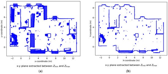 Plots of the x–y planes with the x- and y-coordinates extracted from the point cloud obtained with voxel-grid downsampling. (a) Plot of the x–y plane with x- and y-coordinates extracted between and ; (b) plot of the x–y plane with x- and y-coordinates extracted between and .