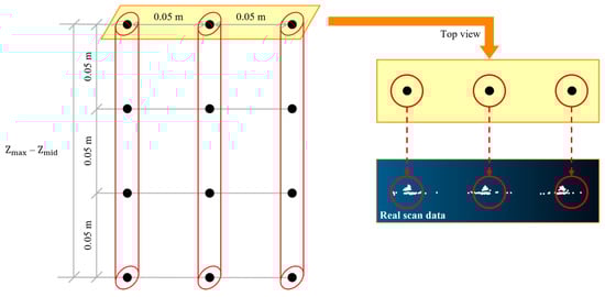 DBSCAN requires two parameters: min points and epsilon. In the proposed method, the min points and epsilon are determined from the voxel size, and . Figure 6 shows an example of the point arrangement of a wall downsampled to a voxel size of 0.05 m as an ideal case. The height of the input point cloud data was determined as the difference between and , and the points were arranged at 0.05 m intervals. When viewed from the top (x–y plane), a cluster is formed in which an integer number of points divided by 0.05 m from the height of the input point cloud data gather at one point on the x–y plane.