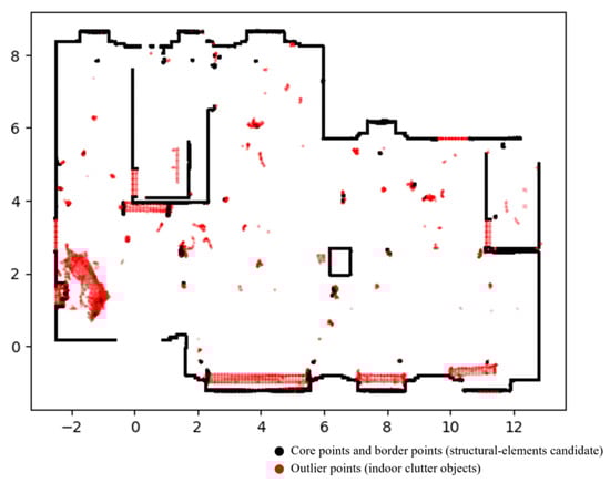Therefore, the ideal epsilon value of DBSCAN operating in the 2D projection x–y plane was set to 0.05 m, which is the same as the voxel size in the proposed method, as shown in Equation (4). The ideal min point value was an integer value that eliminated the decimal point of the value after the division of the height of the input data (arranged in 0.05 intervals). In this study, the authors used an integer value obtained by subtracting two from the ideal min point value to account for possible omitted points, as shown in Equation (5). This approach allows for a more robust clustering result, even when some points may be missing from the data. Figure 7 shows the results following the use of the min points and the epsilon determined based on the height of the input data and the voxel size. The red points in Figure 7 indicate the data determined to be outlier points, and the black points include the core points and border points. The proposed method defines the structural element candidates as the core points and border points, which are the result of DBSCAN. The authors utilized DBSCAN algorithm in scikit-learn library (ver. 1.2.0).