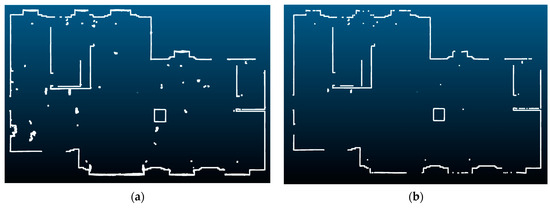 Several studies applied other line-fitting methods to obtain more accurate lines of structural elements. Kim and Lee [25] applied a voxelization-based method to obtain structural element lines. They utilized the horizontal slice between the floor and ceiling, which is the most clutter-free slice. Martens and Blankenbach [26] adopted morphological operations on the x–y plane of a point cloud to remove indoor noise. Wu et al. [27] developed a Modified Ring-Stepping Clustering (M-RSC) method to extract structural element lines in complex indoor environments. However, their method involved a manual task to remove indoor clutter object data. Macher et al. [28] applied the Maximum Likelihood Estimation SAMple Consensus (MLESAC) method to extract structural element lines. After that, the indoor clutter objects were removed from the structural element point that was obtained from the structural element line.