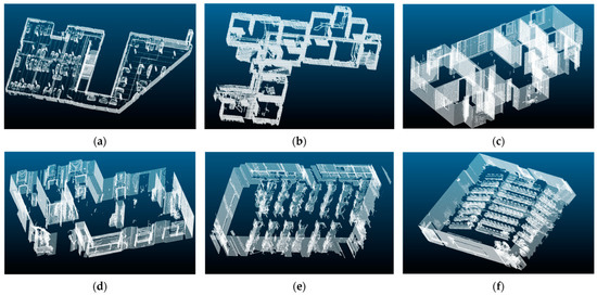 Experimental data downsampled to a voxel size of 0.05 m from where the floors and ceilings were removed: (a) parking lot, (b) basement, (c) apartment 1, (d) apartment 2, (e) lecture room 1, and (f) lecture room 2.