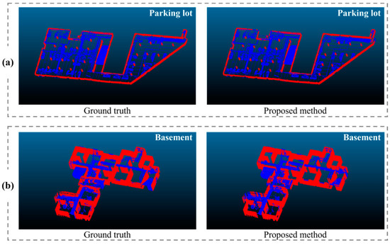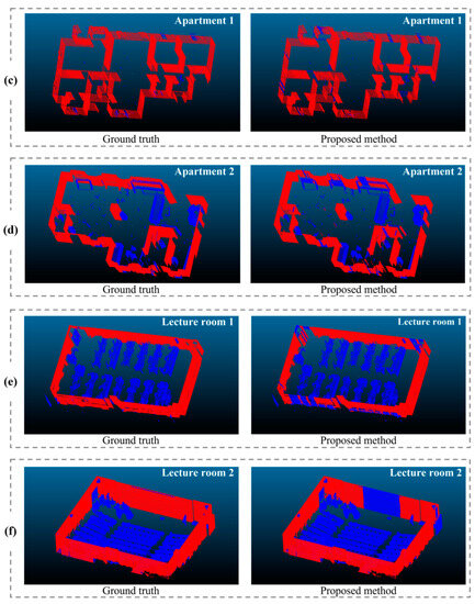 To evaluate the proposed method’s performance appropriately, this study applied voxel-grid downsampling and removed the floor and ceiling from the point cloud data. The ground truth data was manually labelled and classified into structural elements and indoor clutter objects. The red points indicate the structural elements, while the blue points indicate indoor clutter objects. This study compared the ground truth labels with the results of classifying the six experimental datasets into structural elements and indoor clutter objects using the proposed method.